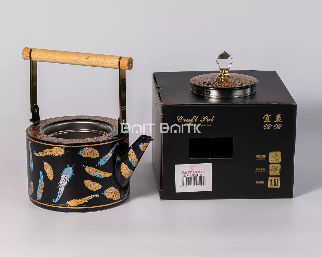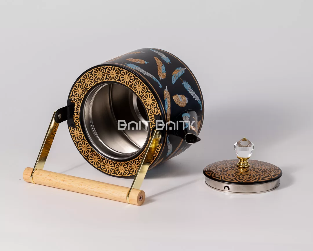 إبريق شيك باللون الأسود المطفي مع نقشة ريش ولمسات ذهبية وزرقاء، داخل ستانلس ستيل وغطاء بقبضة كريستالية ومقبض خشبي فخم. مثالي للضيافة والهدية.