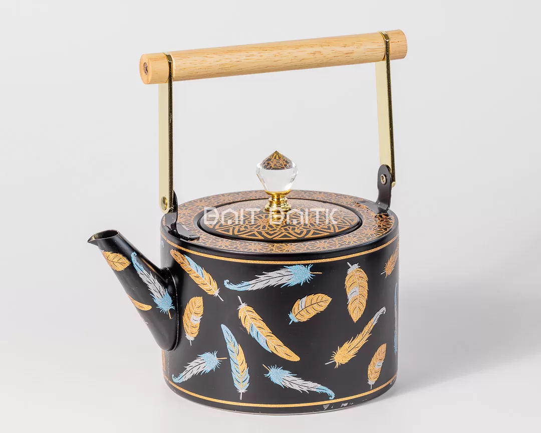 3. إبريق شاي أسود مطفي بنقشة ريش ولمسات ذهبية وزرقاء – 1.5 لتر