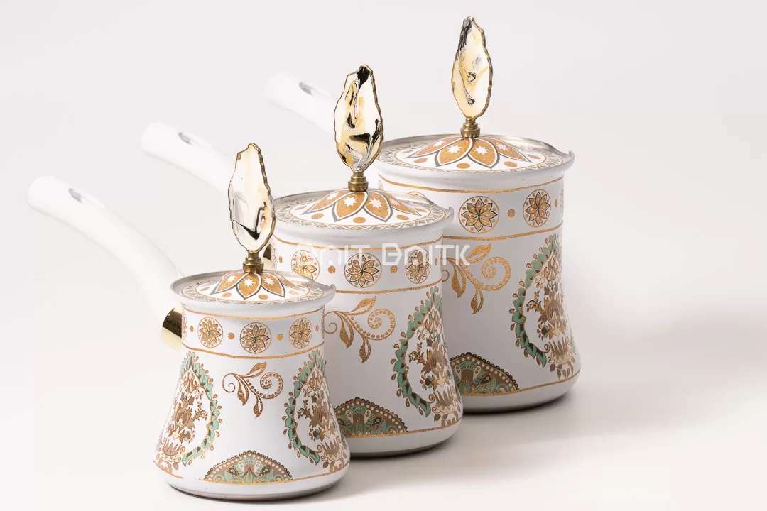 أولاً، هذا طقم ركوات قهوة تركية أبيض مكوّن من ثلاث قطع.