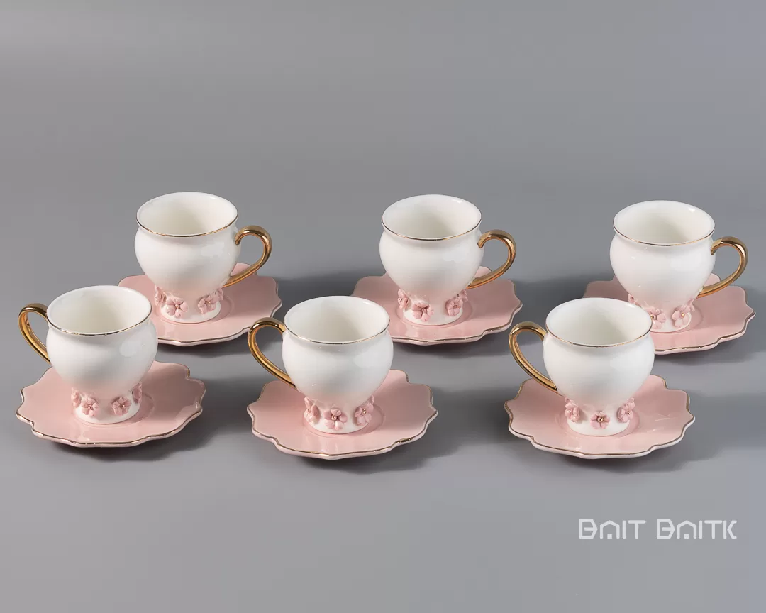 أولاً، يقدّم طقم فناجين القهوة مع الصحون باللون الوردي شكلاً ناعماً وأنيقاً على طاولة القهوة.