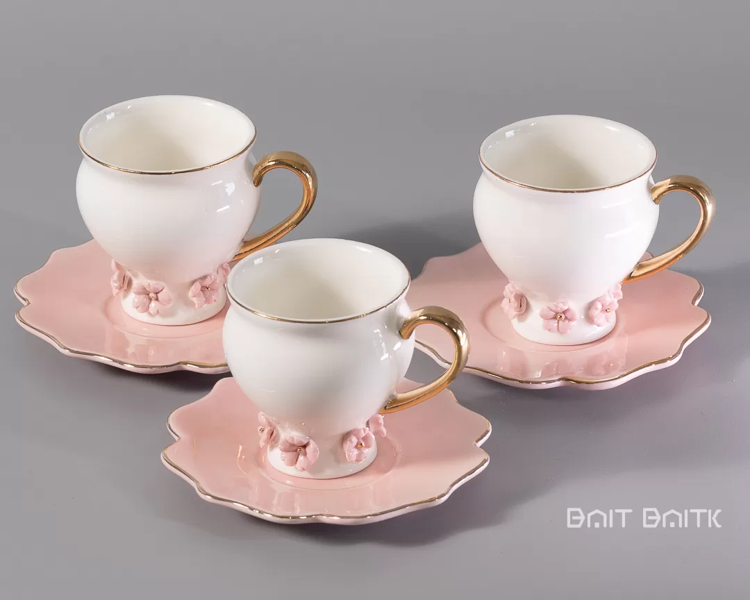 ثانياً، تحتوي الفناجين على زهور بارزة صغيرة حول القاعدة، لذلك يبدو التصميم وكأنه قطعة فنية لطيفة ومناسبة لجلسات القهوة المميّزة.