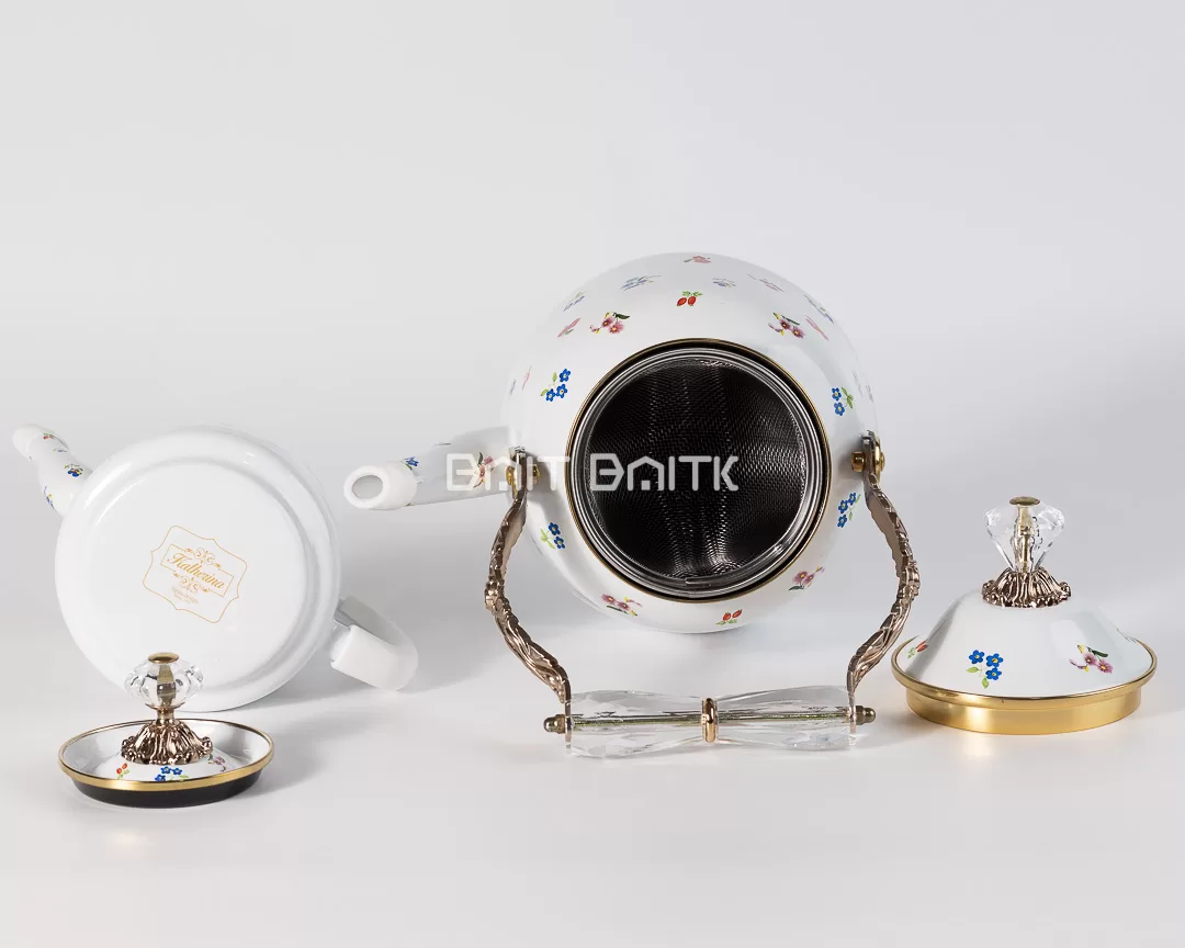 طقم شاي مينا مزهر أبيض بلمسات ذهبية هو خيار أنيق للبيت والضيافة. أولًا، التصميم المزهر بيعطي طاولة الشاي لمسة ناعمة ومرتبة. بالإضافة إلى ذلك، الحواف الذهبية وقطعة الغطاء الكريستالية بتزيده فخامة، وبالتالي بيكون مناسب للتقديم اليومي وللعزومات.