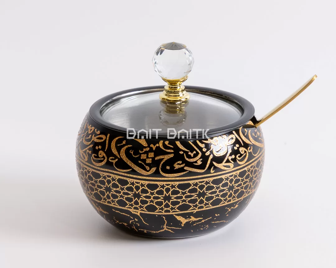 Enhance your serving experience with this luxurious black sugar jar decorated with elegant golden Arabic calligraphy. Its artistic design makes it a perfect choice for premium hospitality or as a decorative kitchen piece.