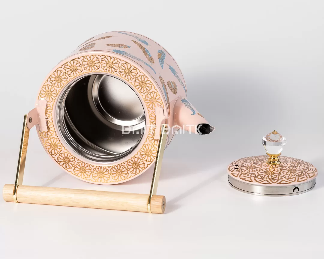 Add a soft, stylish touch to your tea table with this elegant pink tea pot featuring feather prints and refined gold accents. Designed to stand out in hospitality settings, it combines a beautiful decorative exterior with a practical stainless steel interior. The crystal-style knob and wooden handle bar give it a premium, gift-worthy finish.