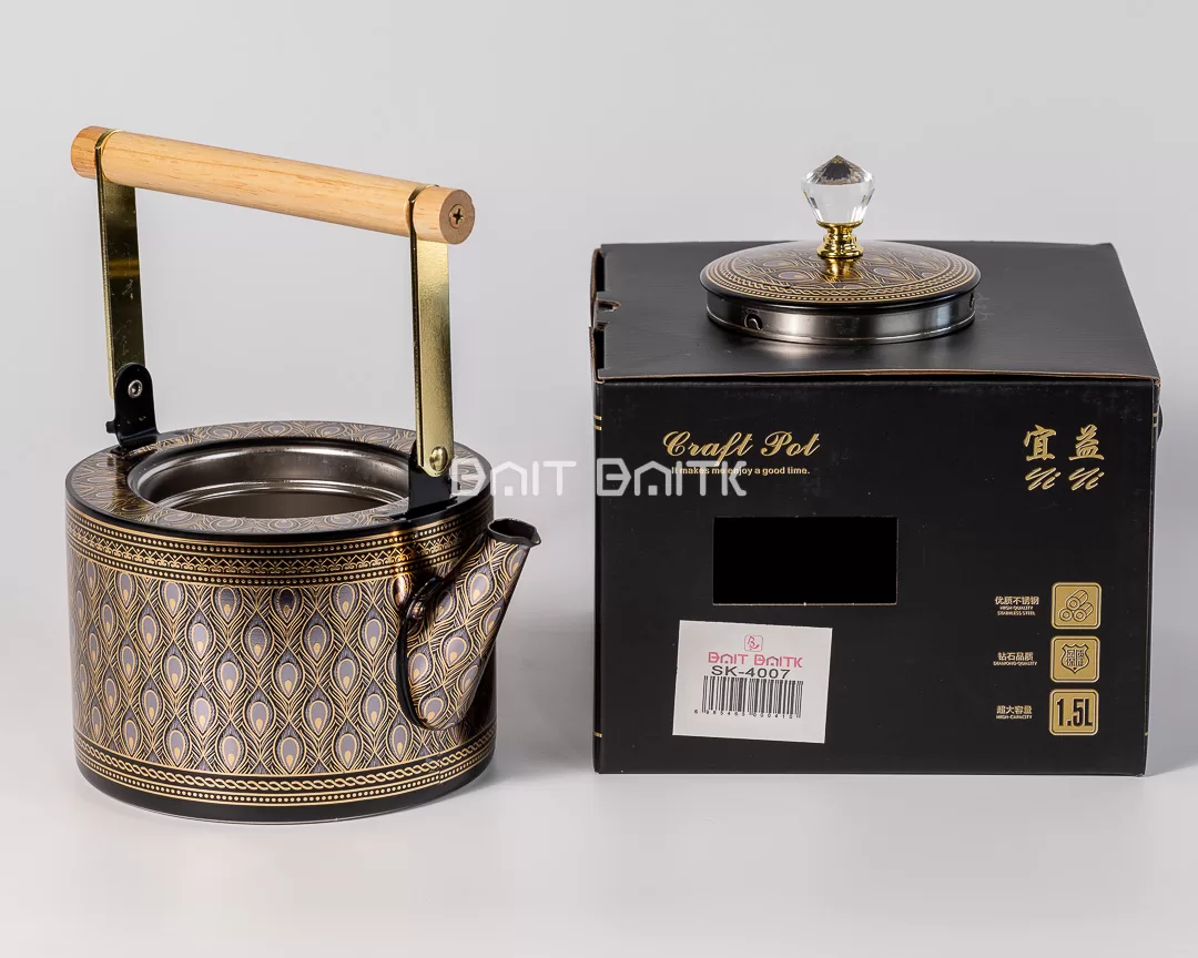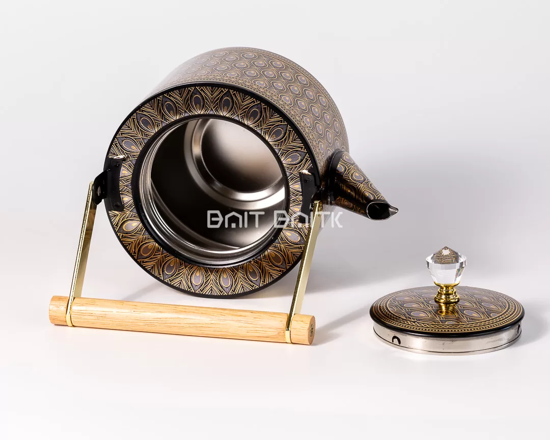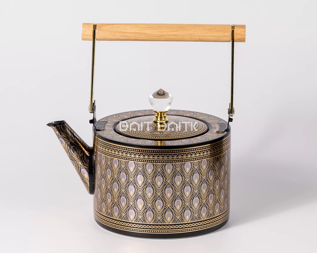Bring a royal touch to your tea table with this luxury black tea pot featuring a peacock-inspired gold pattern and a refined glossy finish. Designed for both beauty and daily use, it includes a stainless steel interior and a crystal-style knob for an elegant look. The wooden handle bar completes the premium aesthetic—perfect for serving tea/coffee and gifting.