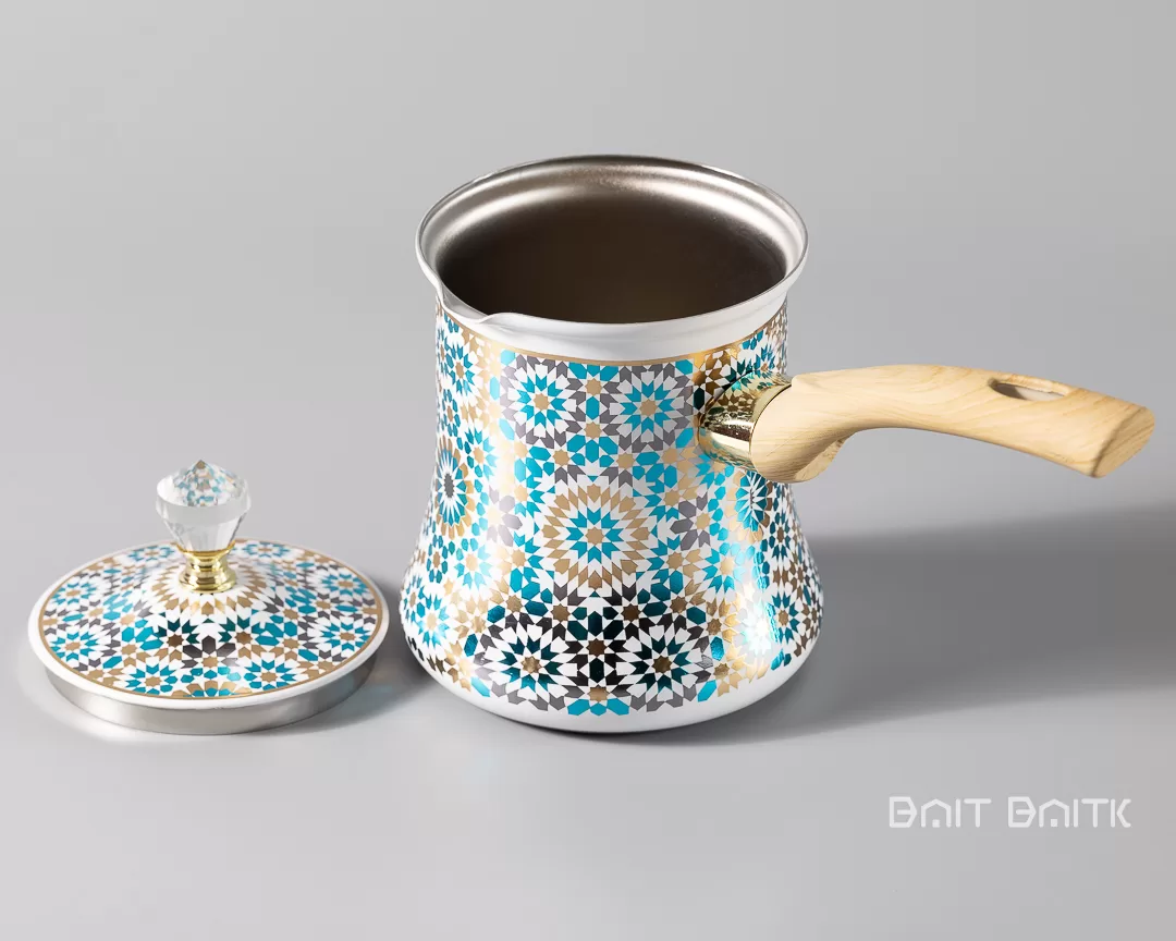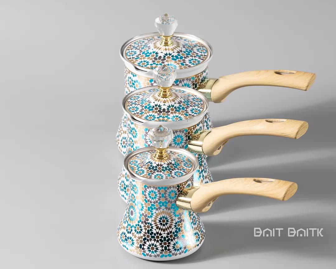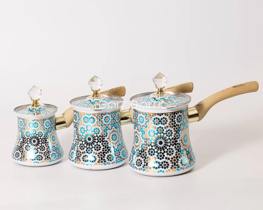 The Moroccan blue Turkish coffee pot set adds colour and elegance to your coffee corner. The three enamel-coated pots feature a mosaic pattern with turquoise, black and gold details inspired by traditional Moroccan art.