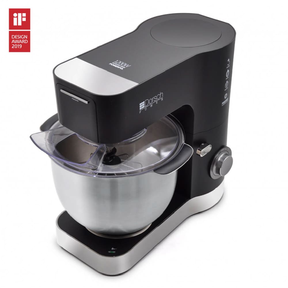 Powerful Dorsch stand mixer 1200W with 5.5L stainless steel bowl, variable speed control and three attachments for dough, whisking and mixing. Perfect for everyday baking and heavy doughs.