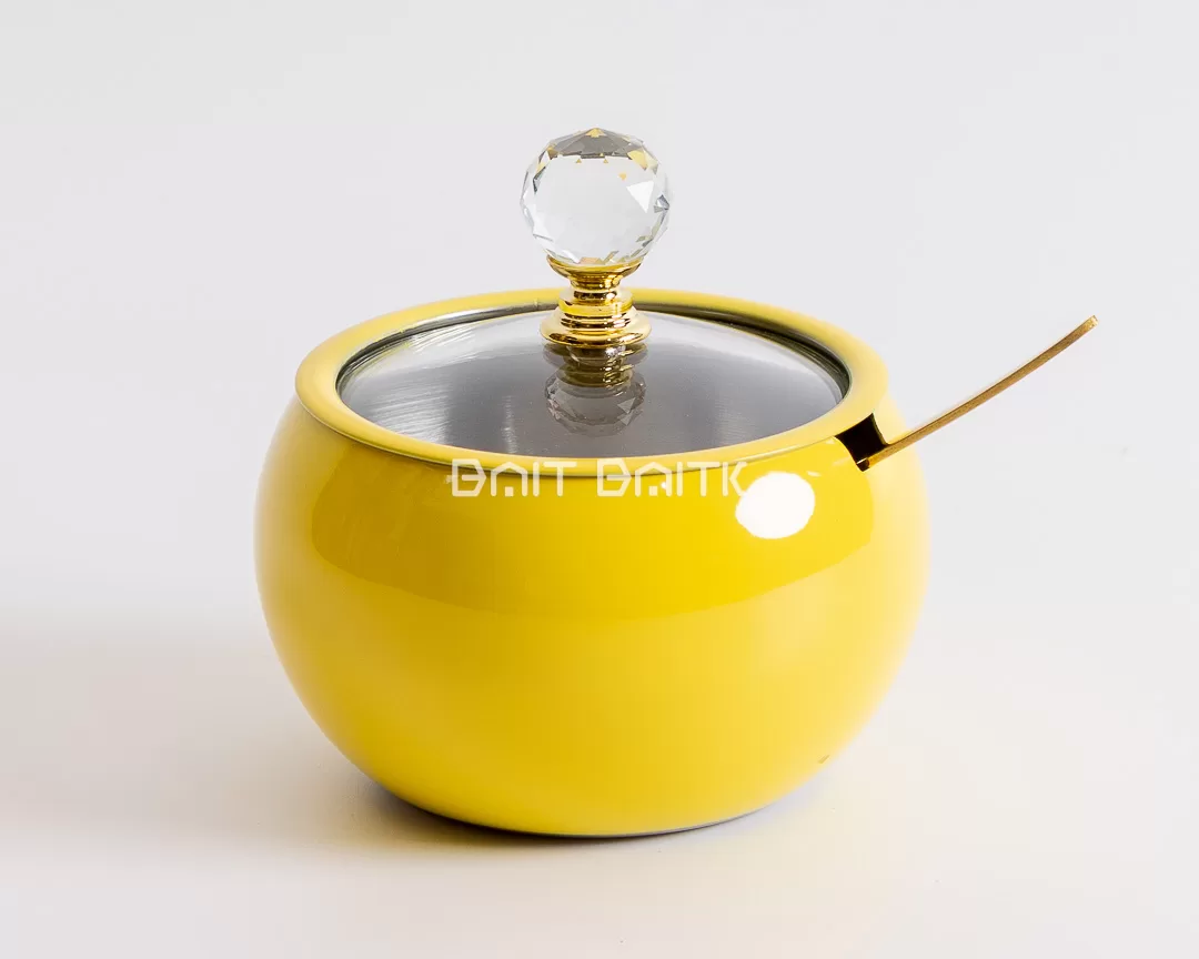 Elevate your serving experience with this luxurious yellow sugar jar. Featuring a sleek stainless-steel lid topped with a crystal handle, it combines elegance with practicality.
